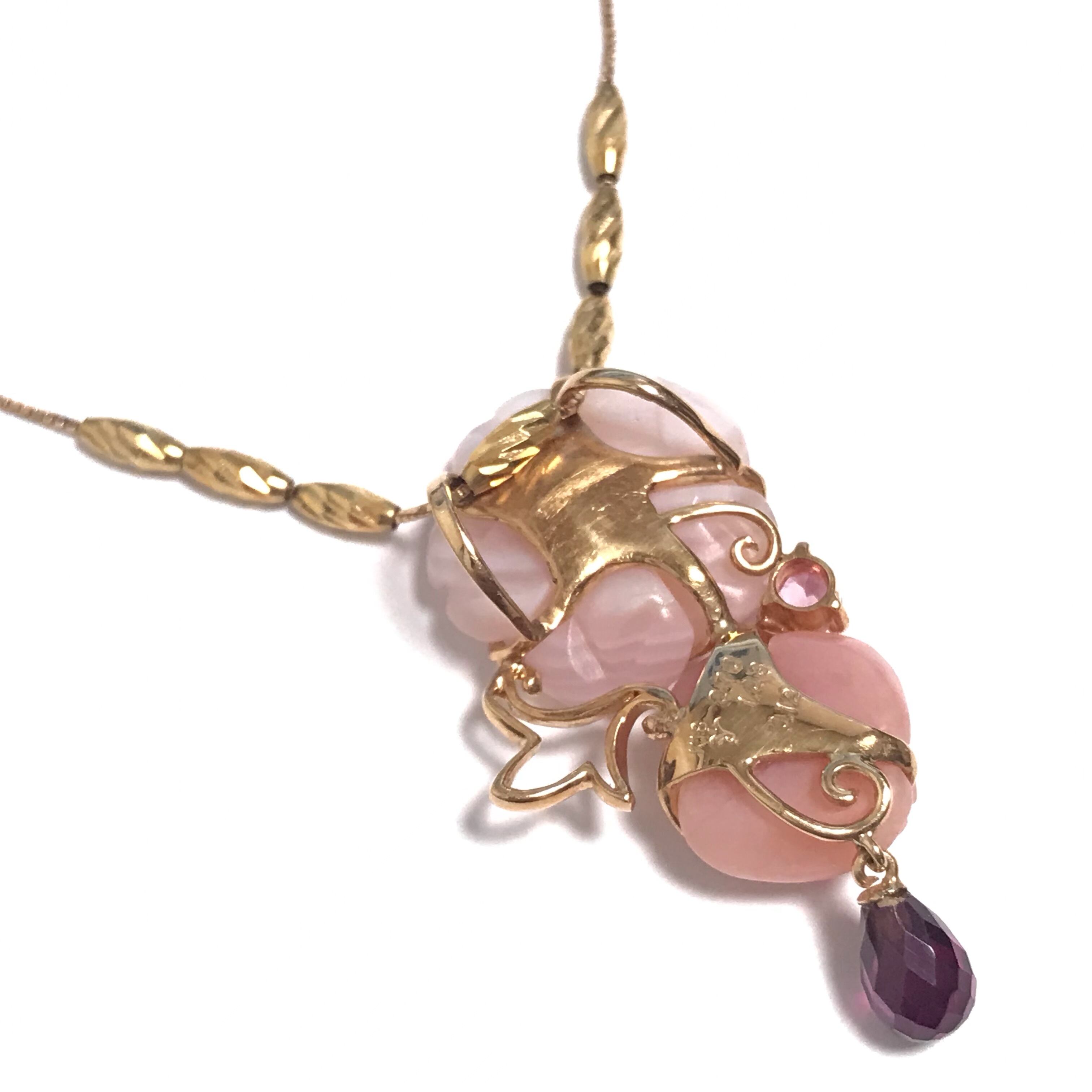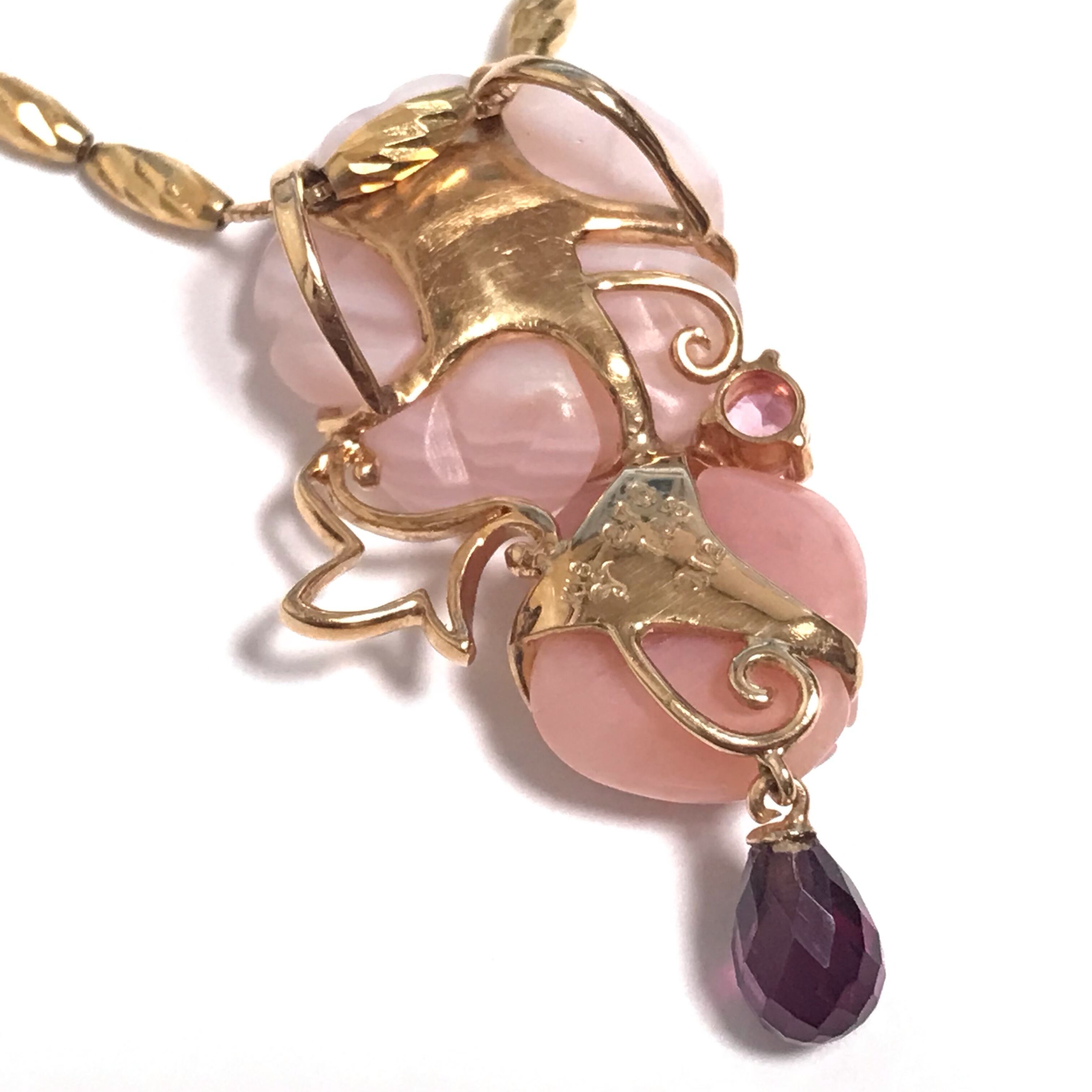 商品:K18 シェルバラデザイン ネックレス ピンク石付き 2.70/1.08/0.12ct イエローゴールド デザインネックレス