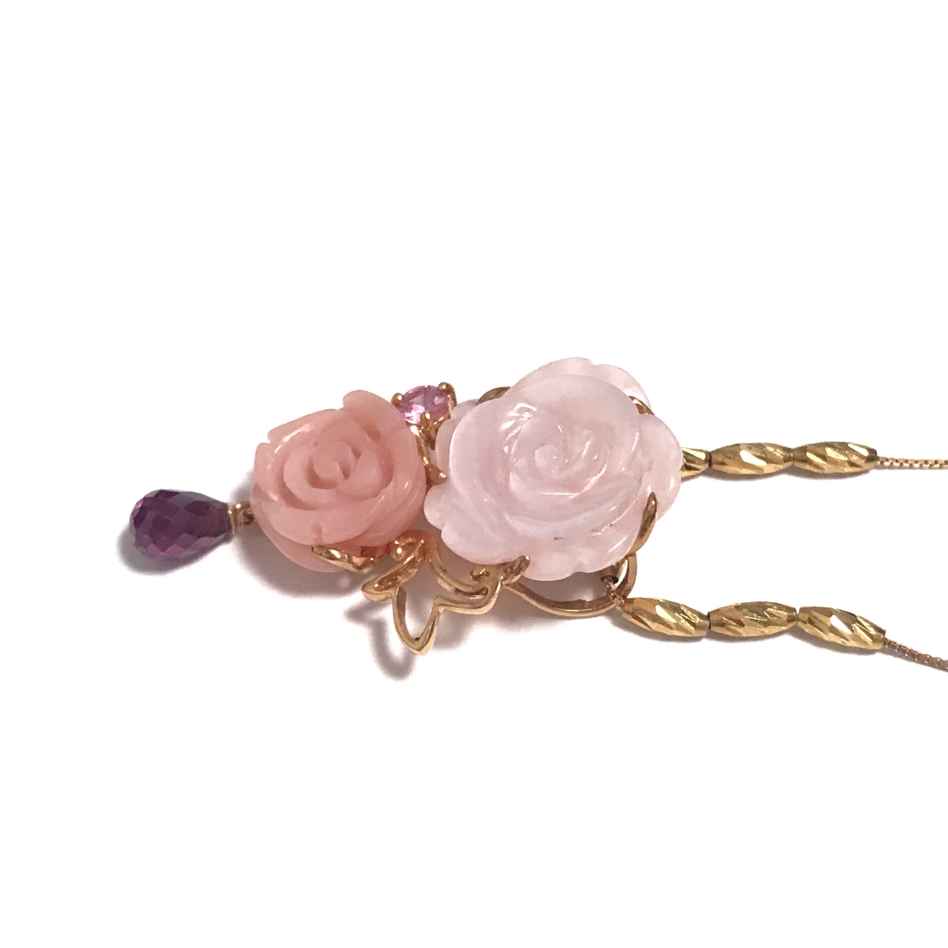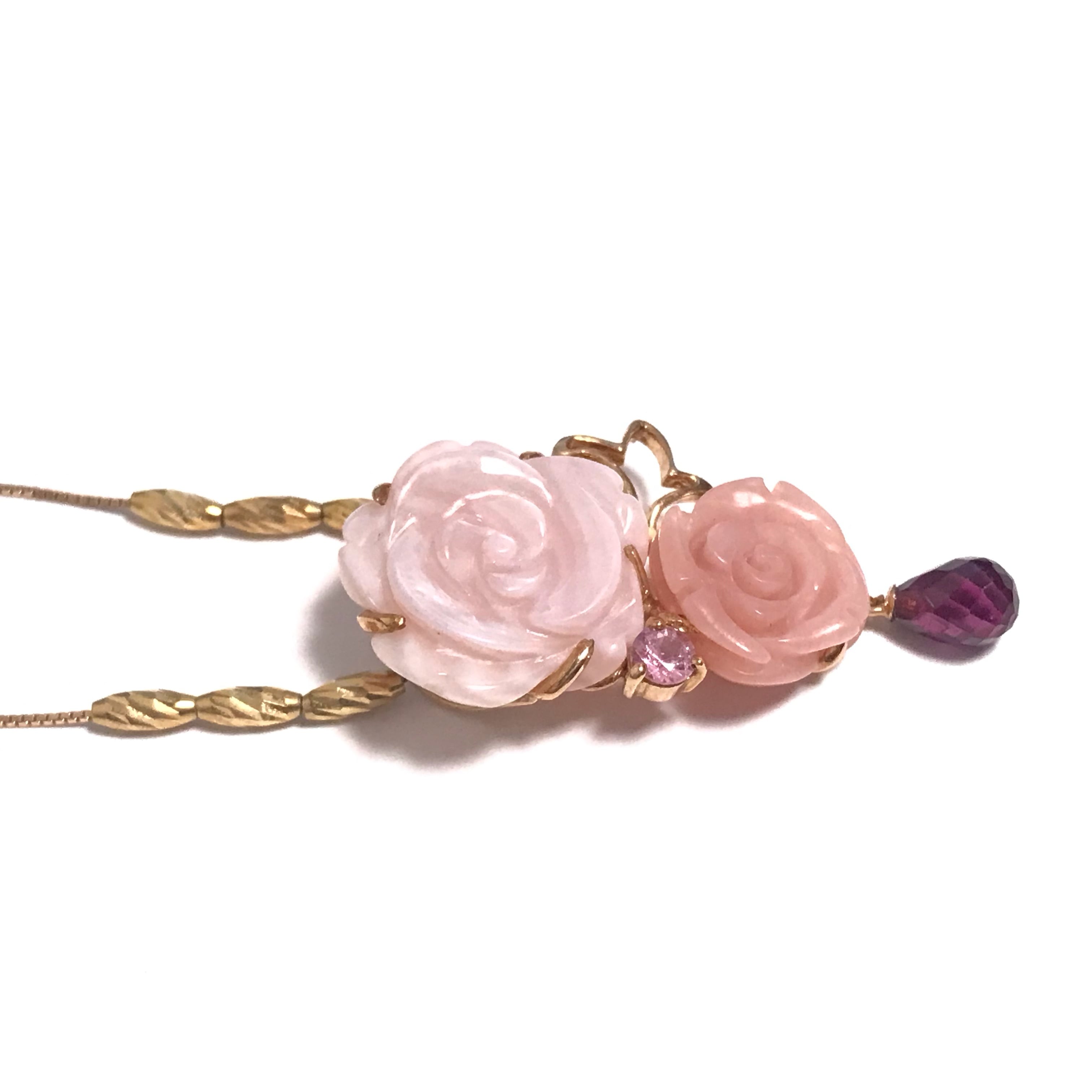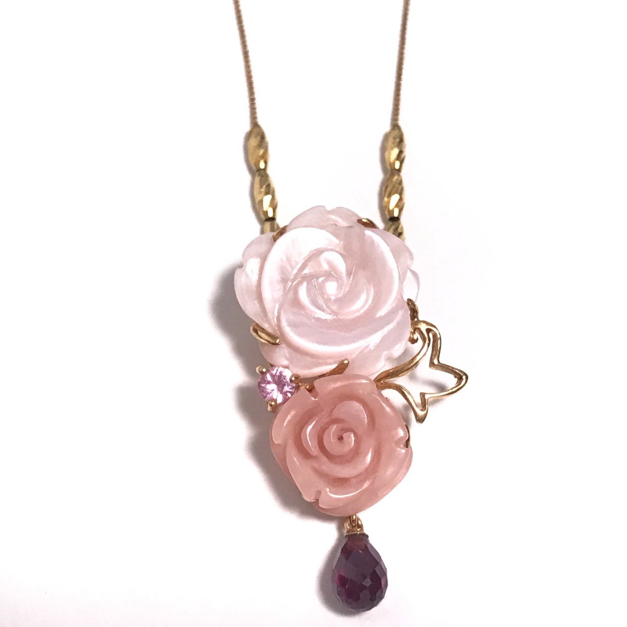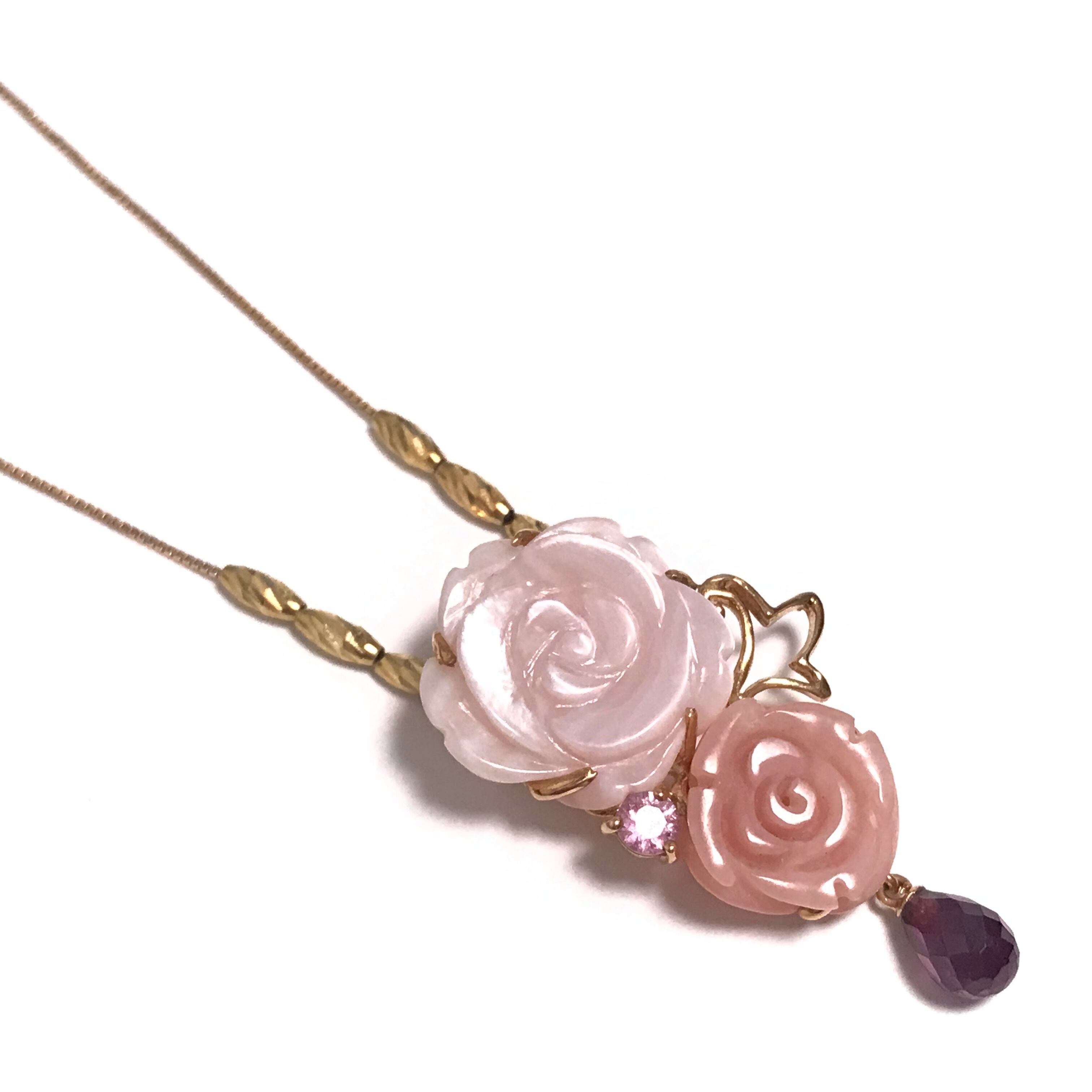 説明:可愛いシェルの大小のバラが二つあしらわれたラブリーなネックレスです。