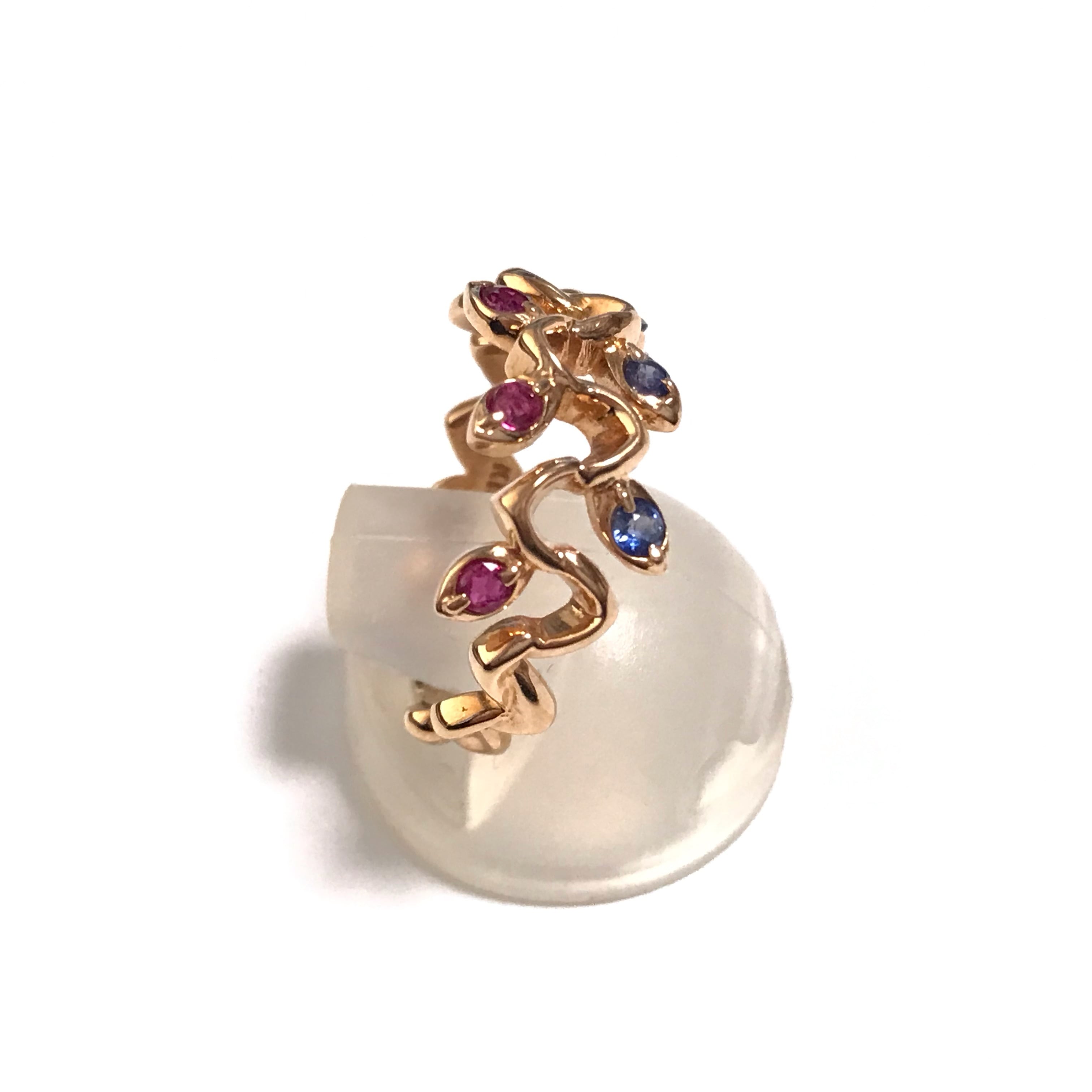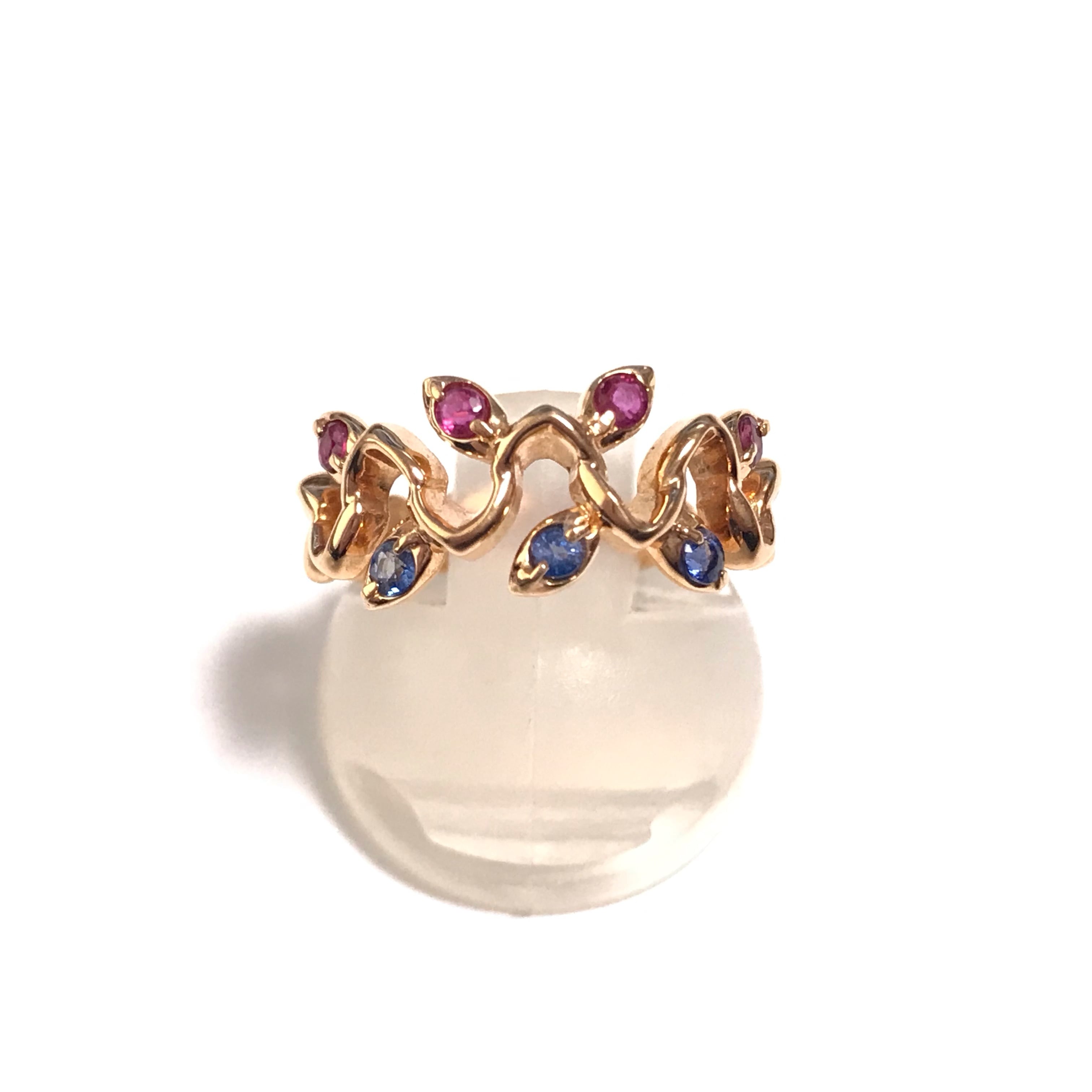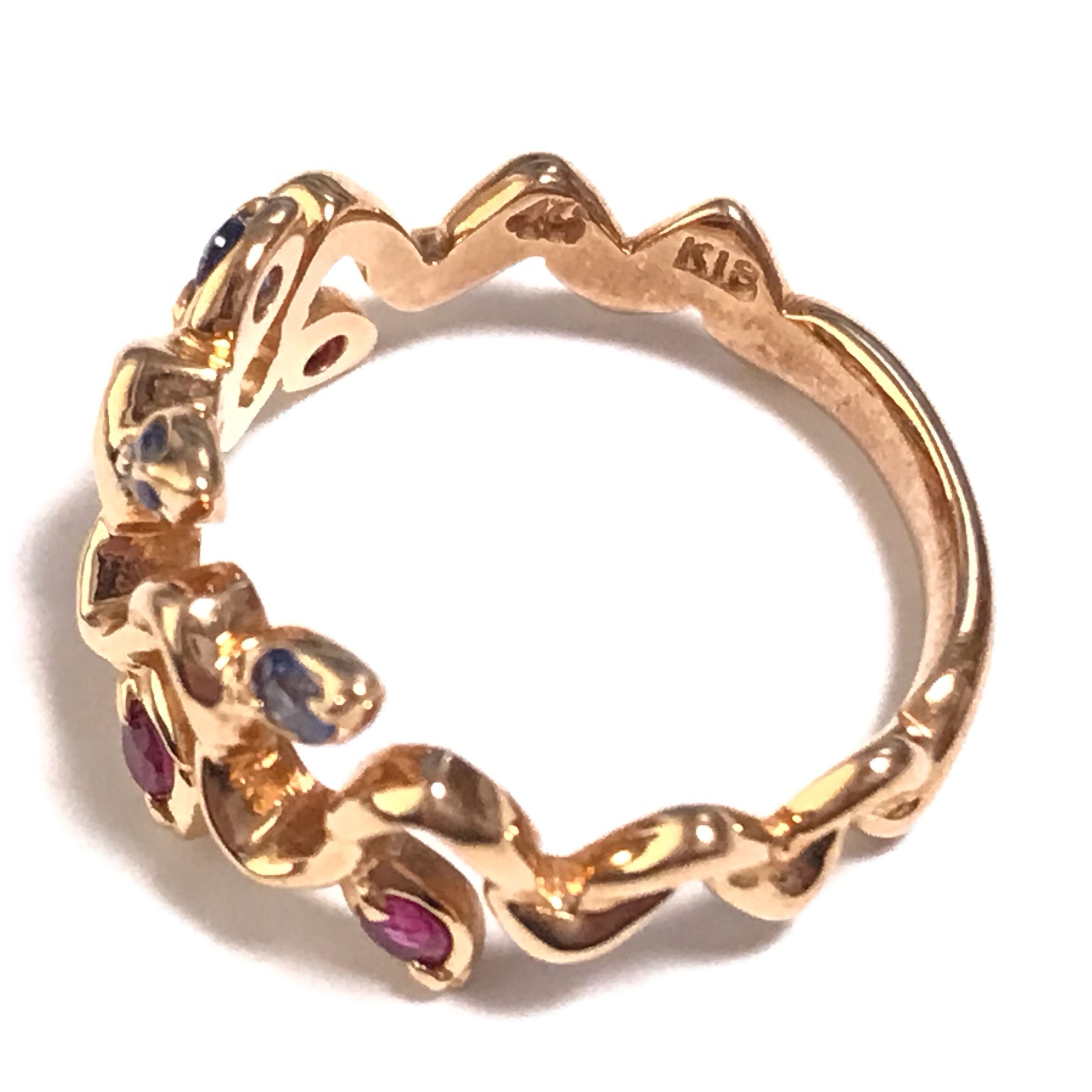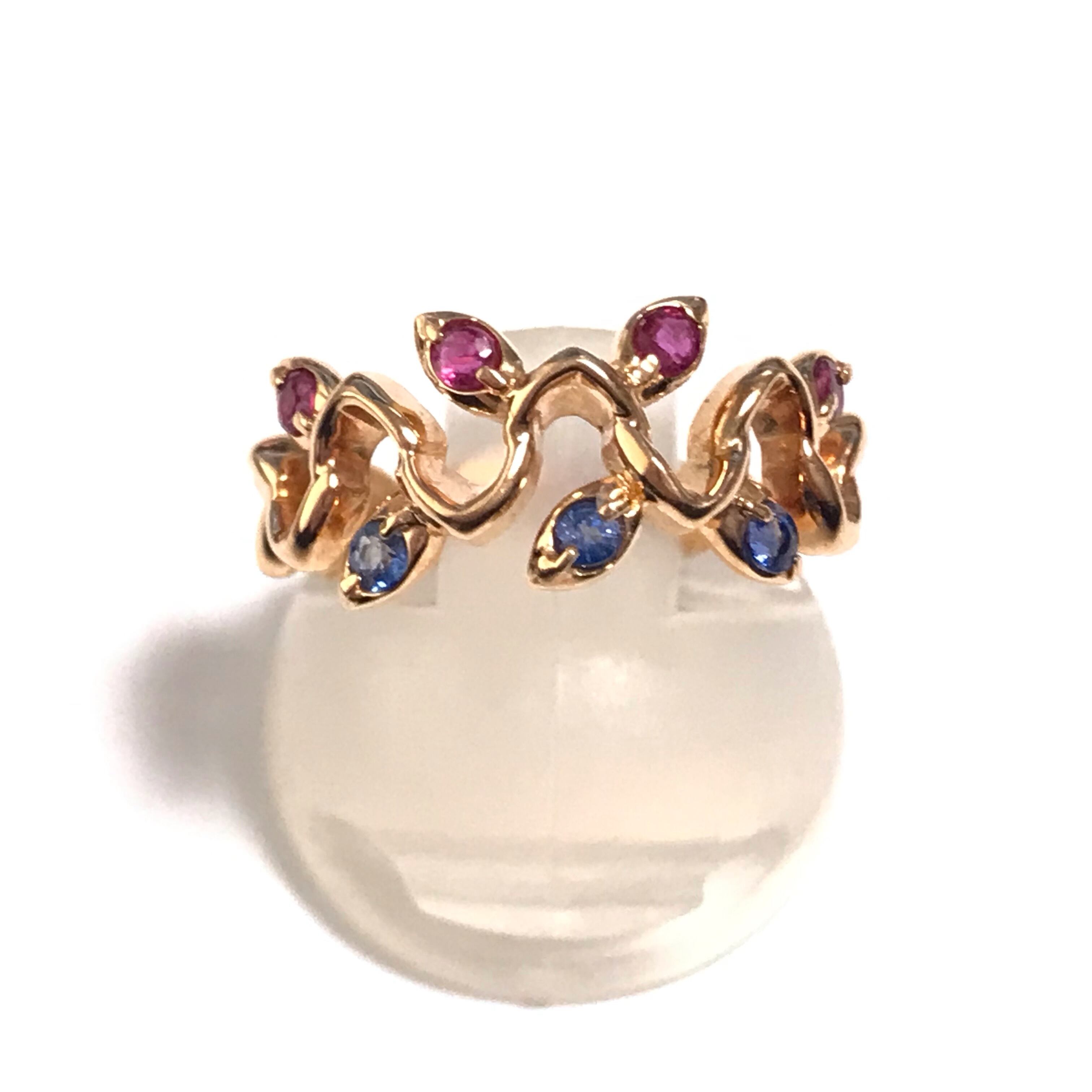 説明:4℃のK18イエローゴールドの素敵なデザインのリングです。ツタのようなデザインに綺麗なルビーとサファイアがあしらわれたリングです。一つでも存在感のあるリングですが、重ね付けしていただいても素敵です。