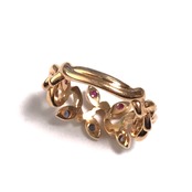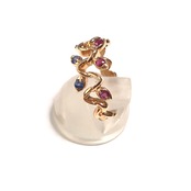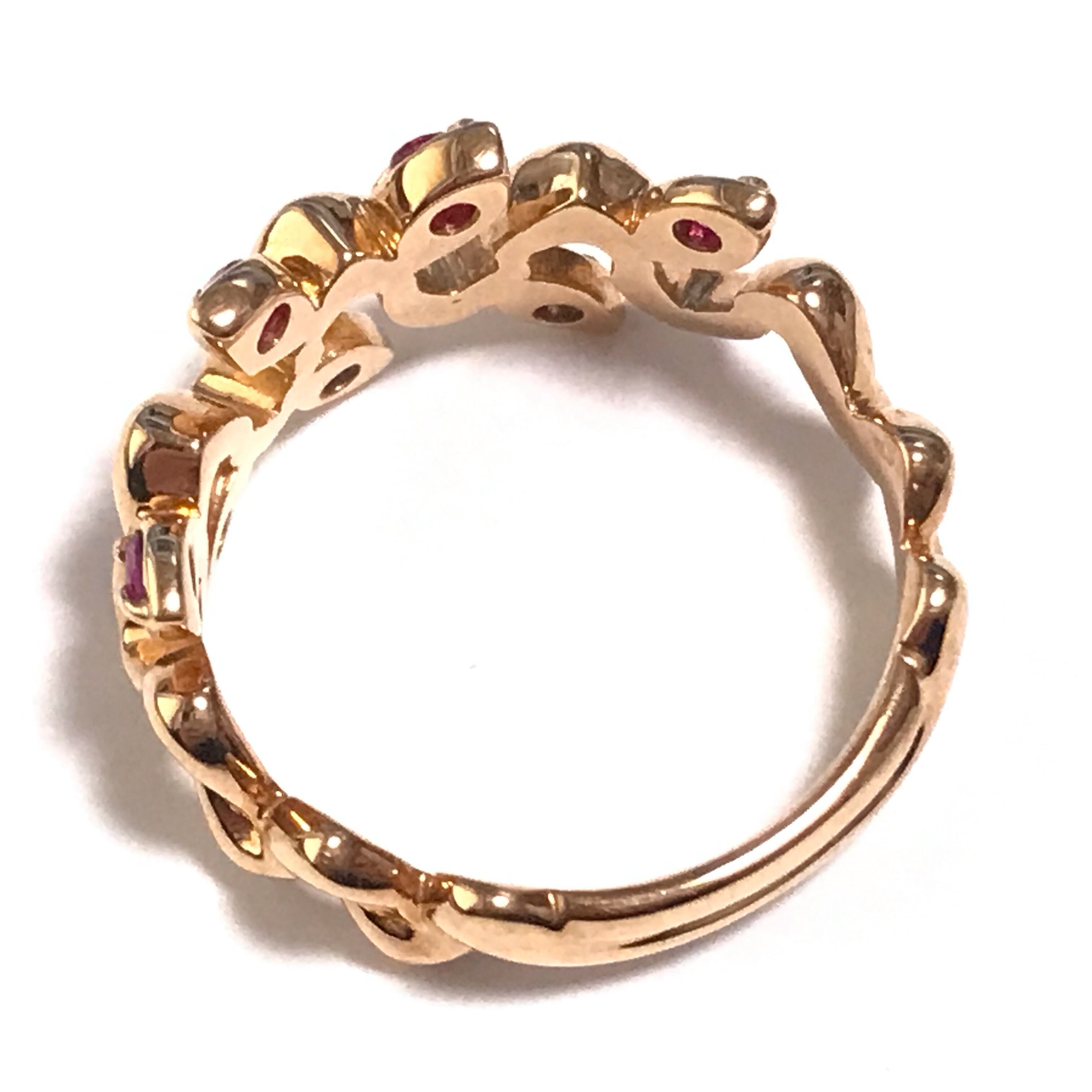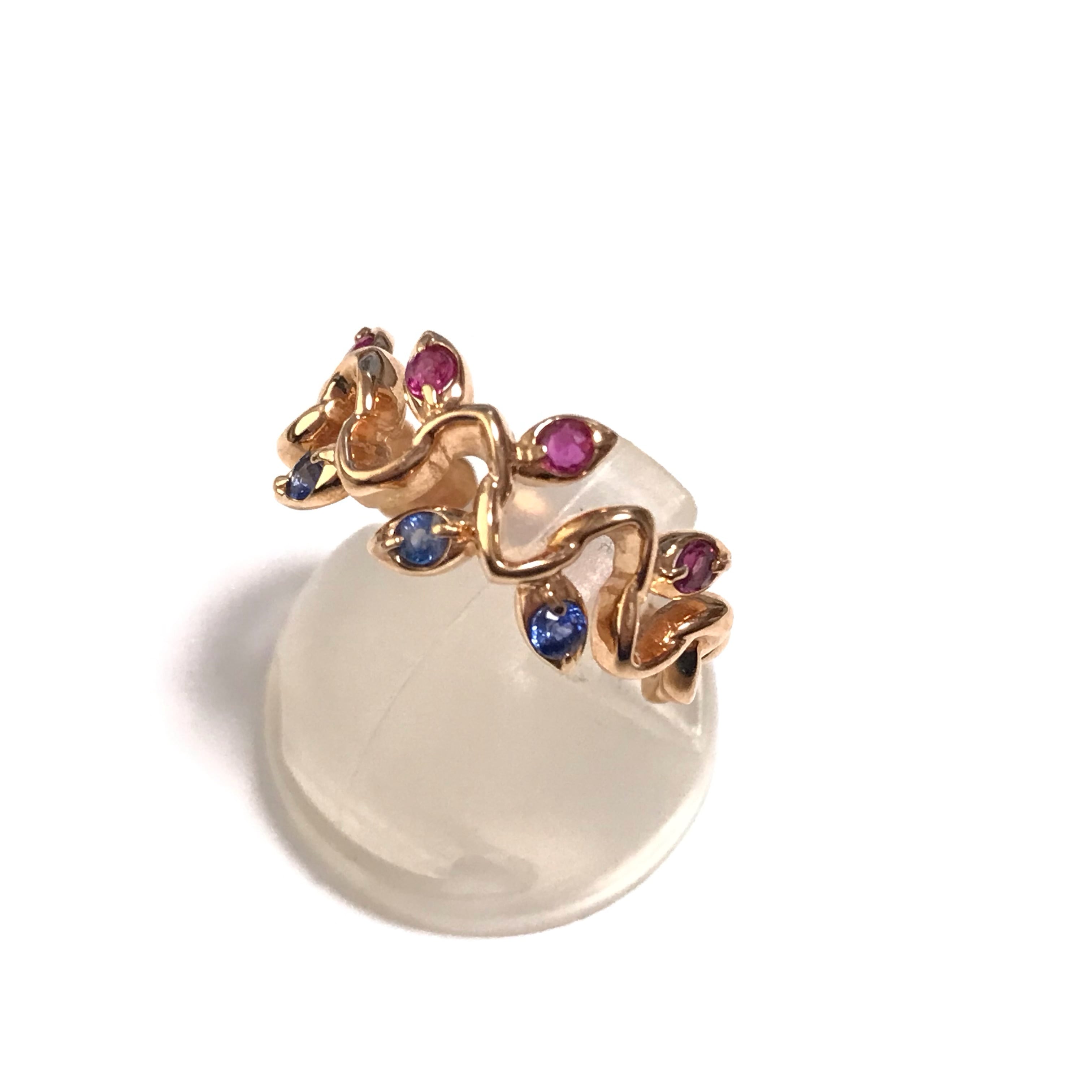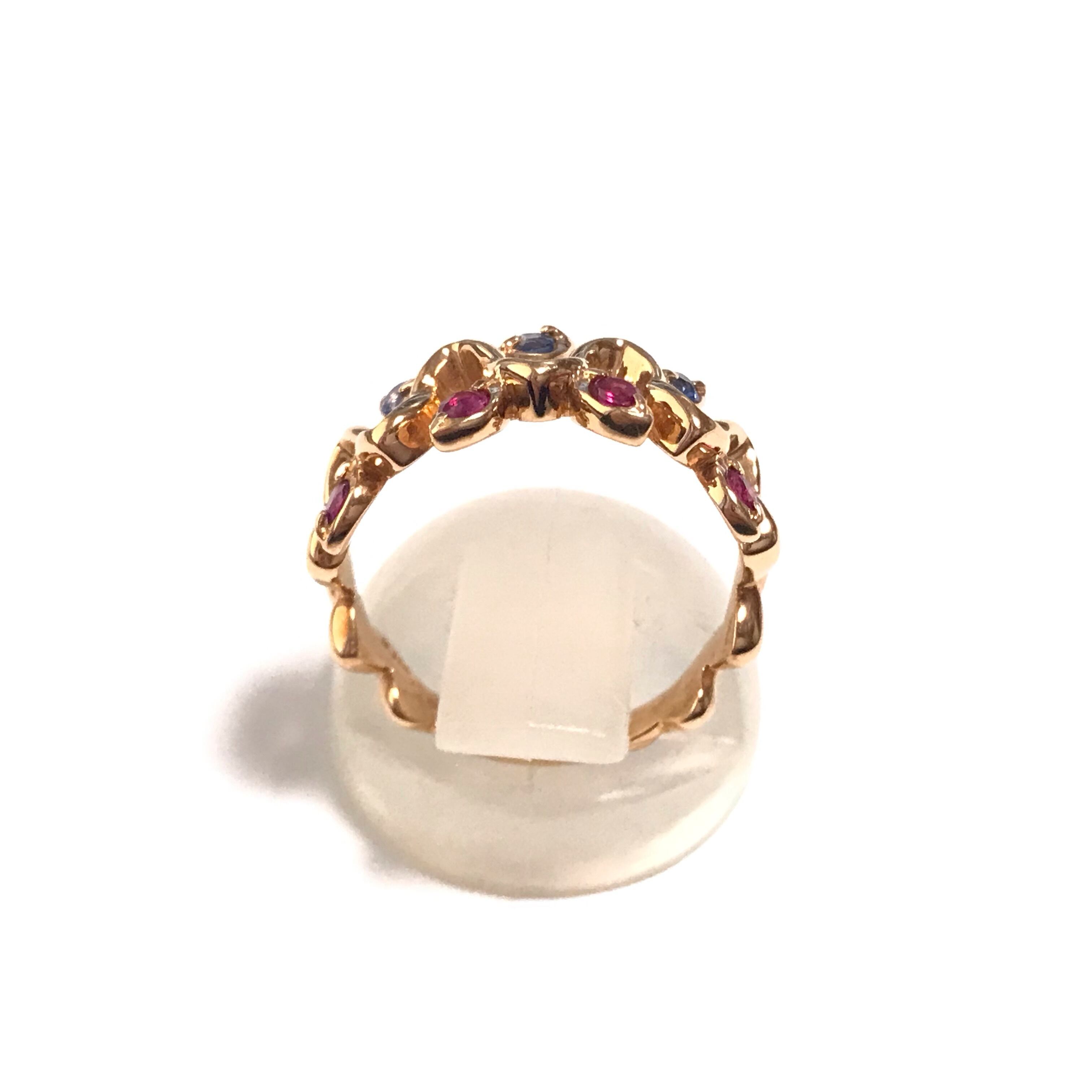説明:4℃のK18イエローゴールドの素敵なデザインのリングです。ツタのようなデザインに綺麗なルビーとサファイアがあしらわれたリングです。一つでも存在感のあるリングですが、重ね付けしていただいても素敵です。